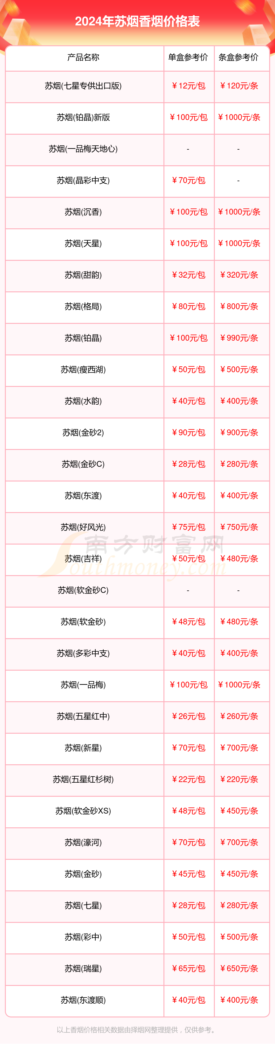 苏烟香烟价格多少一条_2024所有苏烟香烟价格表