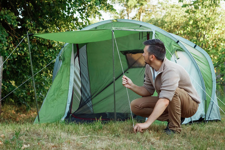一个男人在露营旅行中支起帐篷的肖像