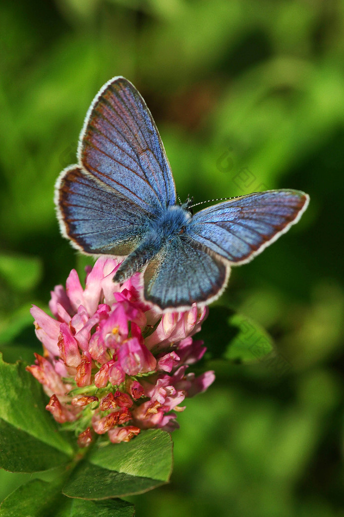 在红三叶草花上的蓝蝴蝶