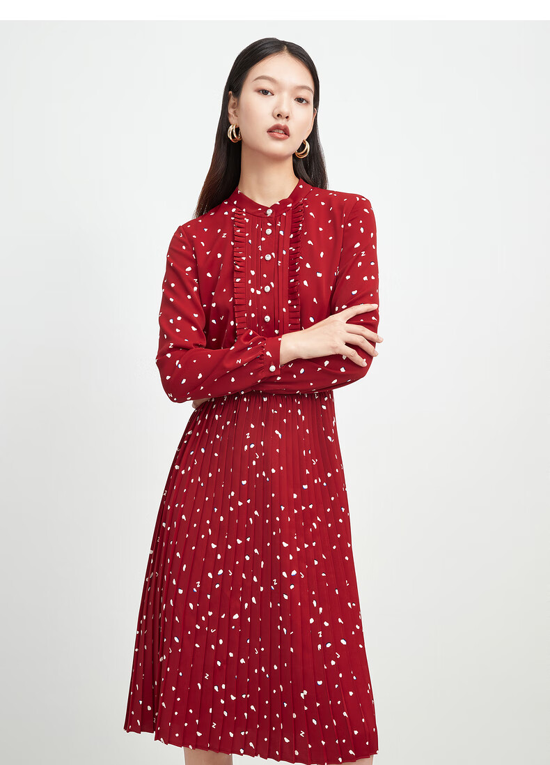 juzui/玖姿2021春季新款红色波点印花收腰中长女雪纺连衣裙 花大红 xl