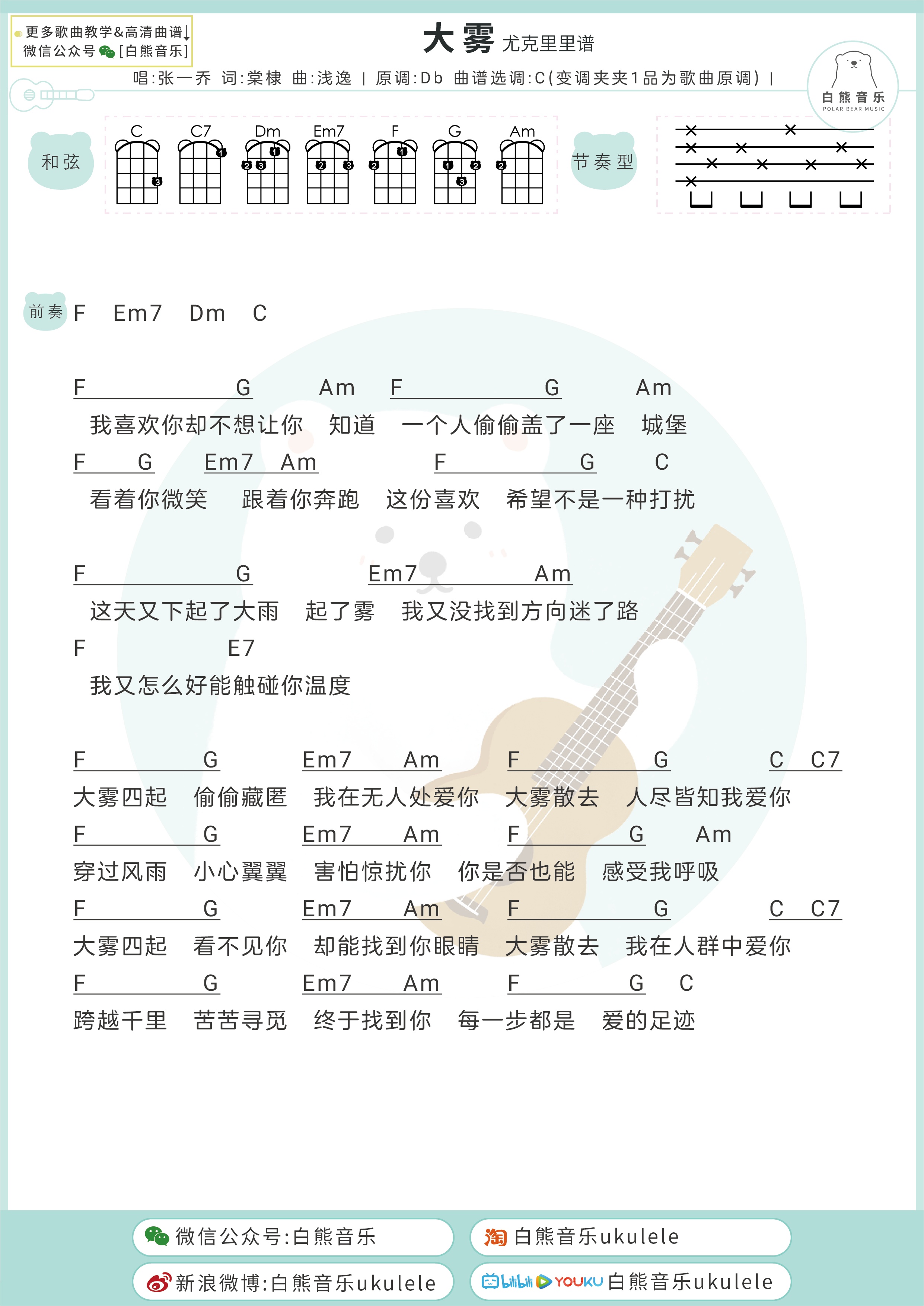 张一乔大雾尤克里里谱c调和弦谱吉他弹唱谱