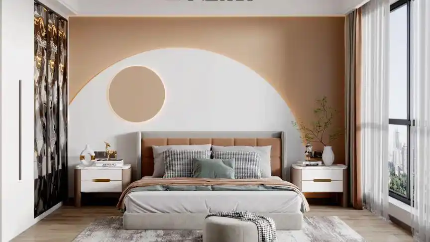 没有选拼色,而是单色 简单又耐看~ 卧室墙面刷的乳胶漆 背景墙奶咖