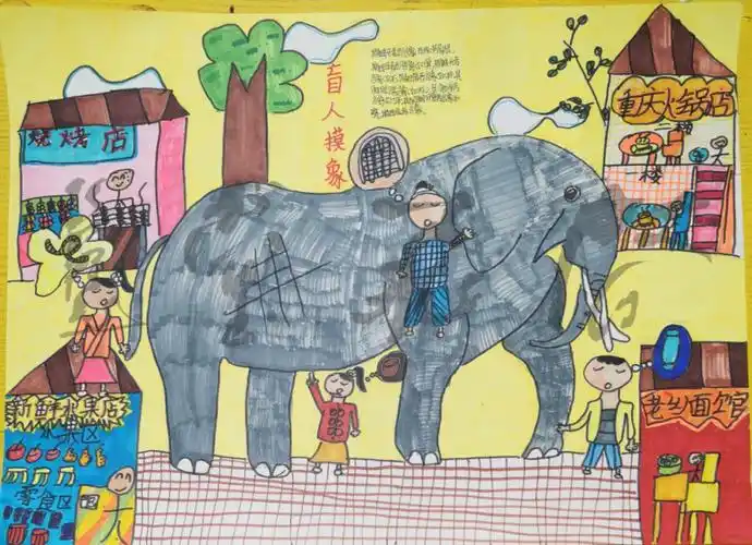齐庚寅书画学校东区儿童画绘画作品――《盲人摸象》