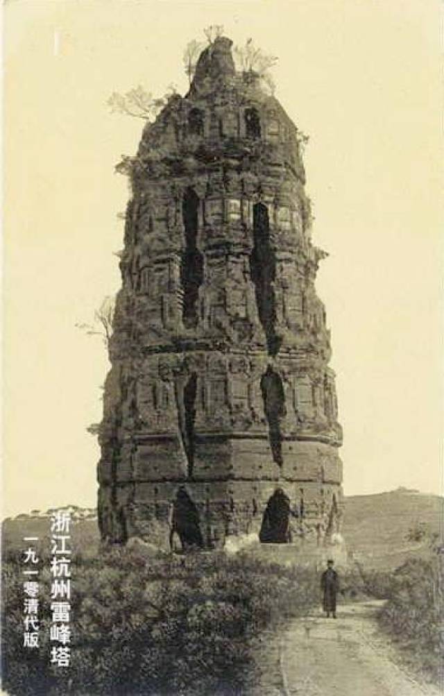 雷峰塔未倒塌时珍贵老照片:木楼廊被烧毁,塔基被当地迷信者盗掘