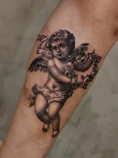 天使雕塑纹身图片_腿部欧美写实纹身图案