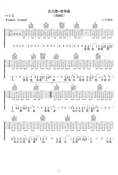 女儿情 牧羊曲吉他谱-好妹妹乐队-c调简易版-看谱啦