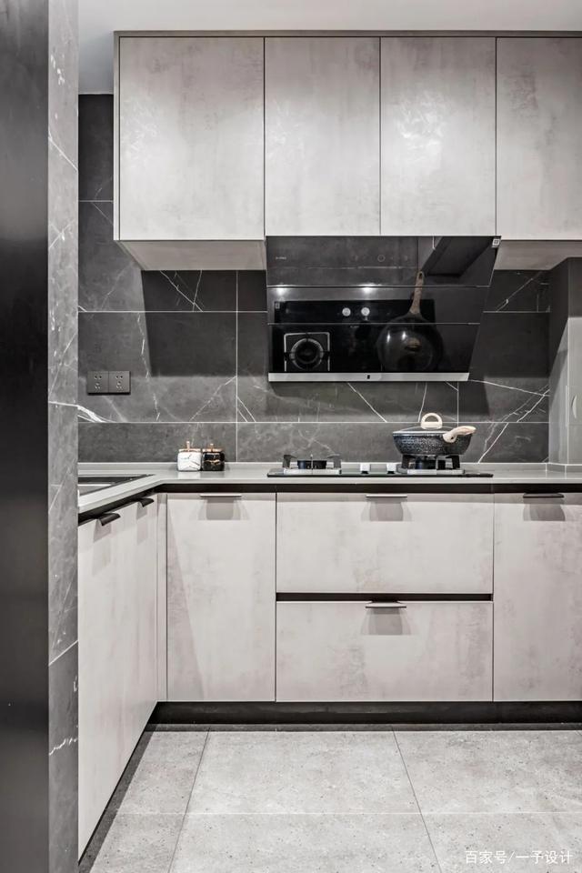 开放式的厨房使空间开阔性更好,深灰色的瓷砖,搭配水泥灰的橱柜好有