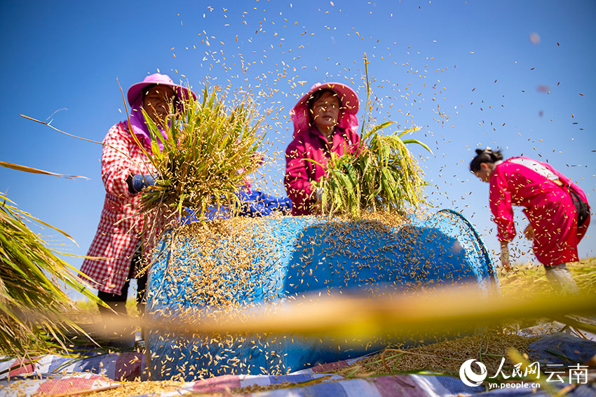 村民正在将水稻脱粒.人民网 虎遵会摄