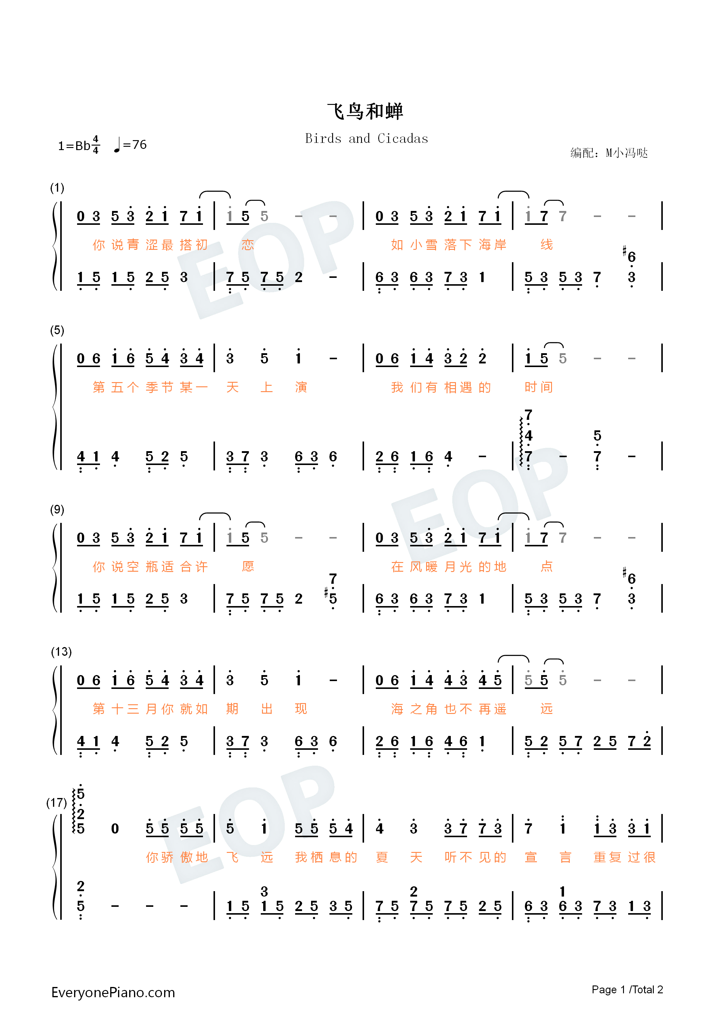 飞鸟和蝉-你骄傲的飞远我栖息的夏天-抖音热歌双手简谱预览1