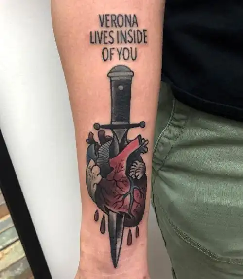男生手臂上心脏和匕首纹身图片心脏纹身图案