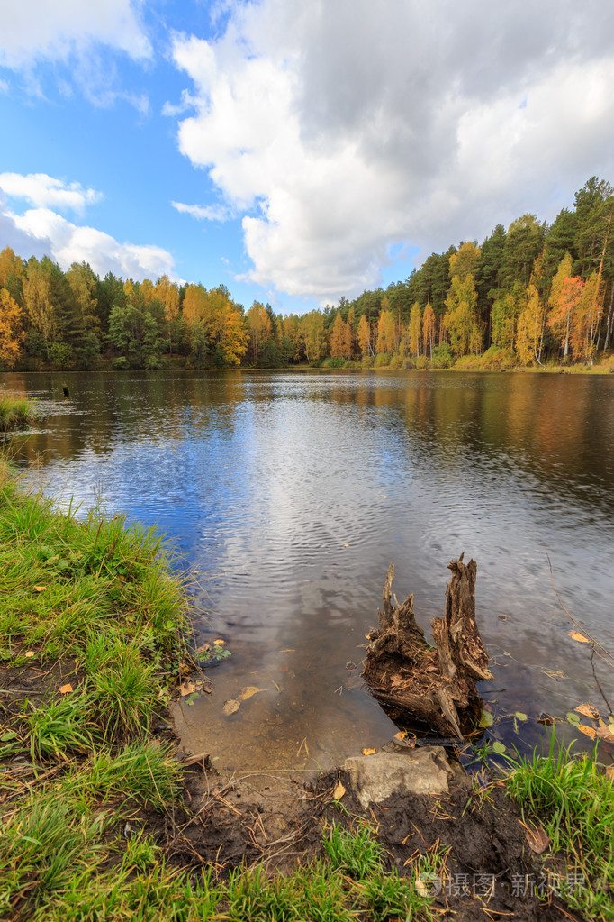 在秋天森林与金黄的桦树,一江秋俄罗斯大自然,白桦树