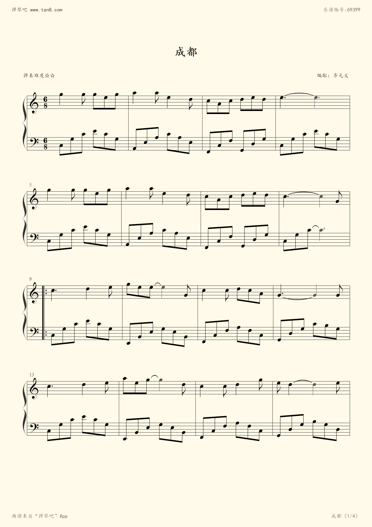 《成都》钢琴谱 带歌词 难度适合学琴1至8个月