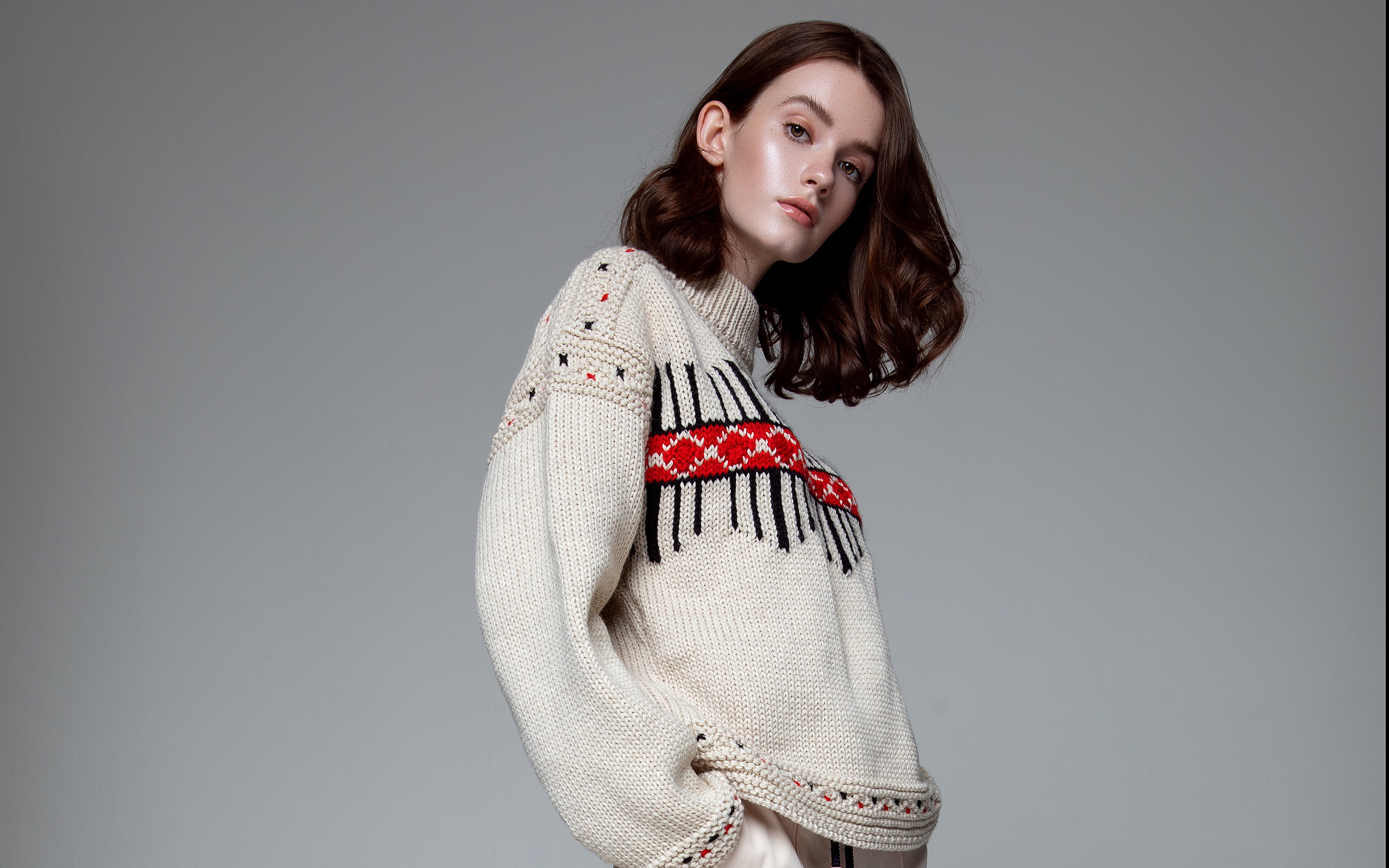 一位年轻漂亮的红发女子的全身垂直肖像,灰色背景,蓝色连衣裙.