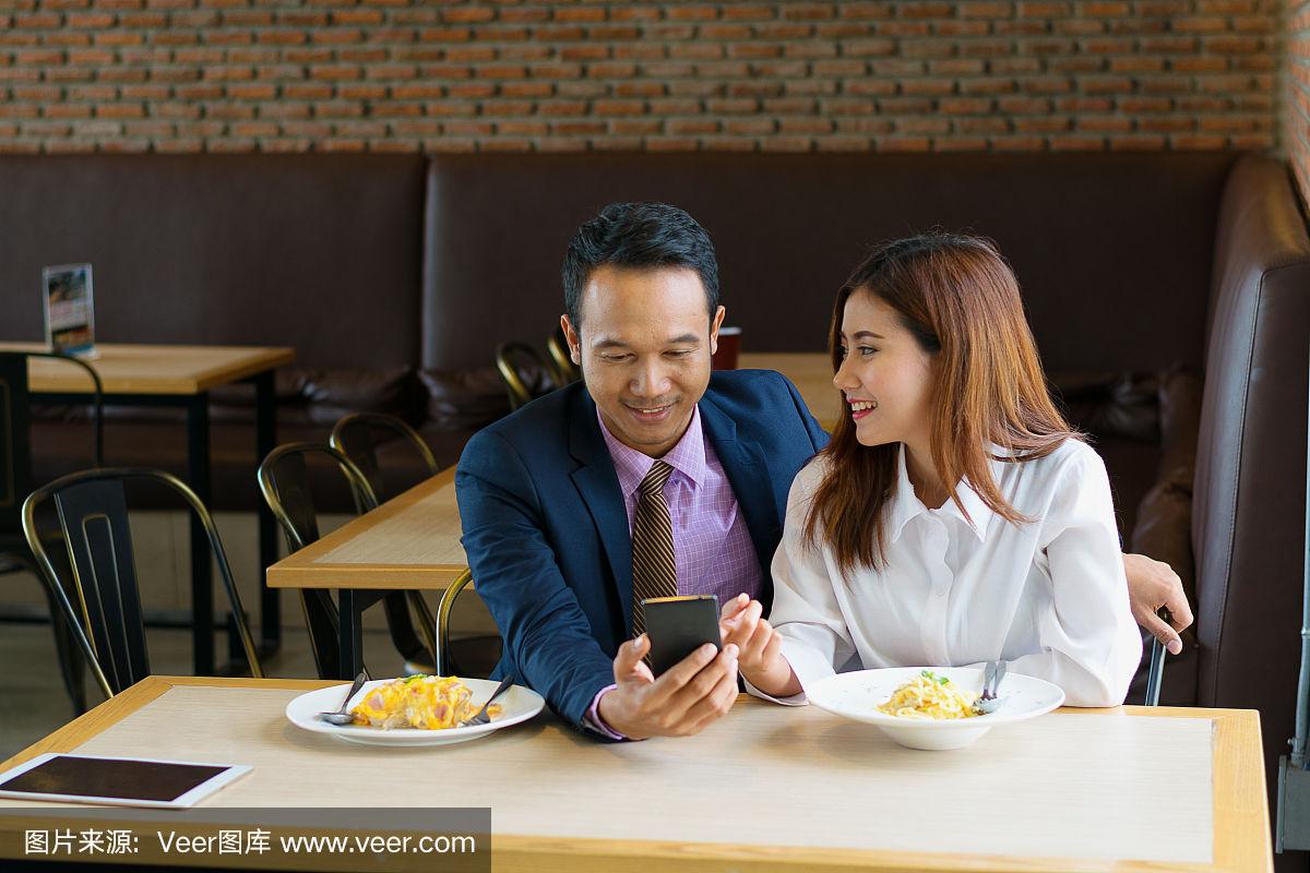 年轻情侣在餐厅里吃饭