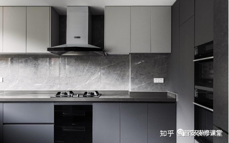 下深上浅非常适合厨房空间,主色调灰色系以后,地柜采用深灰色浅造型