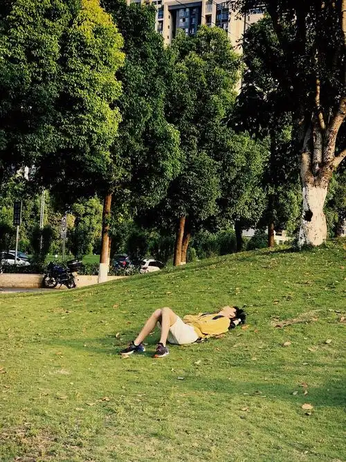 一个人躺在草坪上晒太阳,这就是幸福.