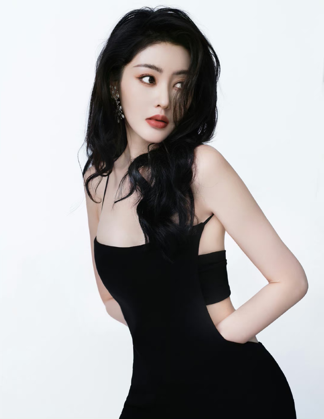 张天爱# 身穿黑色吊带裙,秀丽卷发披肩,明眸皓齿,烈焰红唇,香肩玉背
