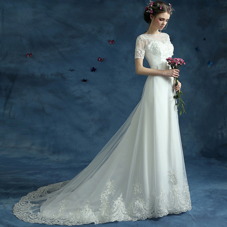 红色婚纱礼服长拖尾立领包肩新娘款韩式简约修身长袖女春 白色拖尾款