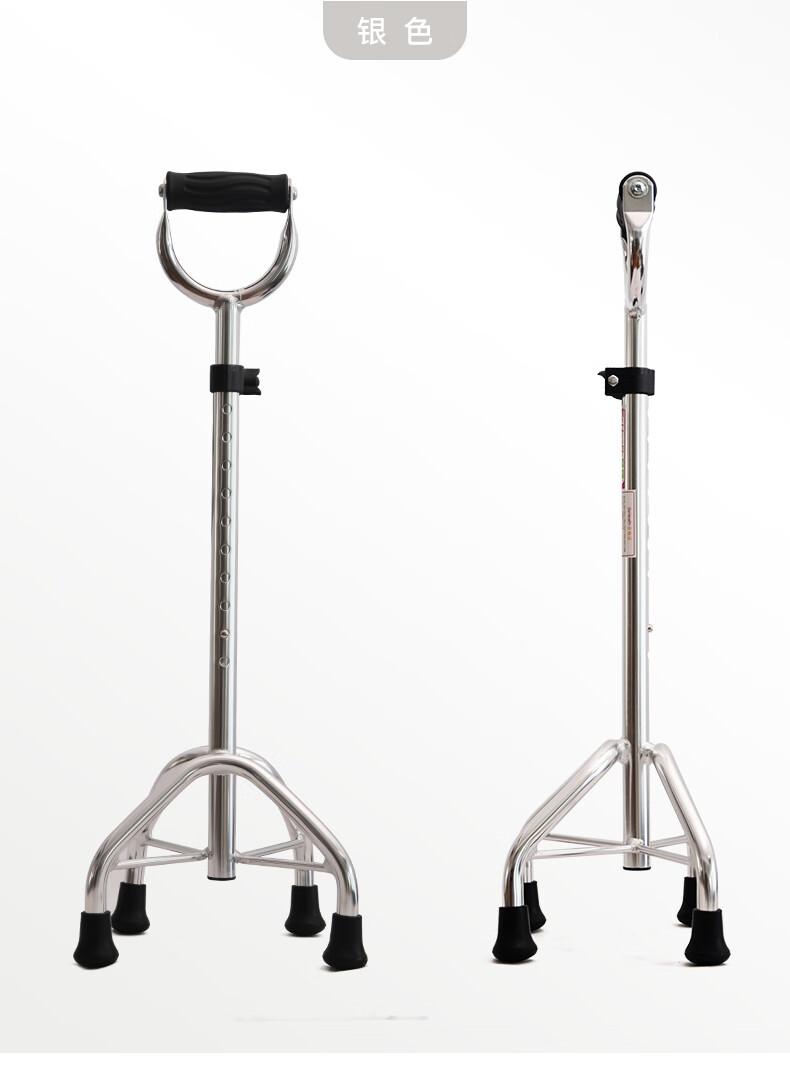 医用老人拐扙拐棍四脚手杖安稳伸缩防滑四角助行器 银色【图片 价格