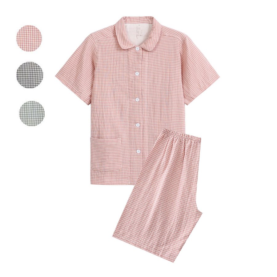 无印细格纹良品全棉双层纱睡衣女纯棉短袖睡衣夏季纯棉短袖家居服