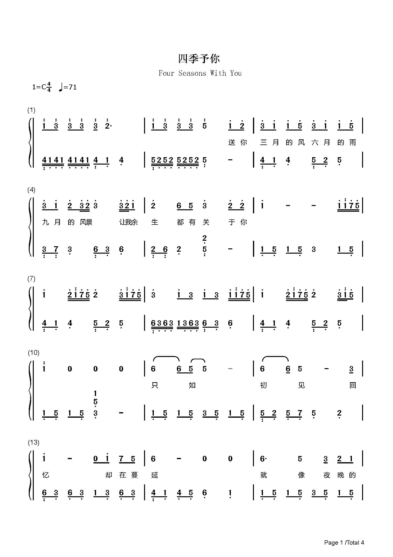 四季予你-送你三月的风六月的雨九月的风景-抖音热歌五线谱预览1-钢琴