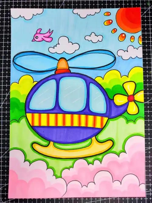 去勾勒外型最后给大型突然颜色#创意儿童画 #马克笔手绘 #直升飞机