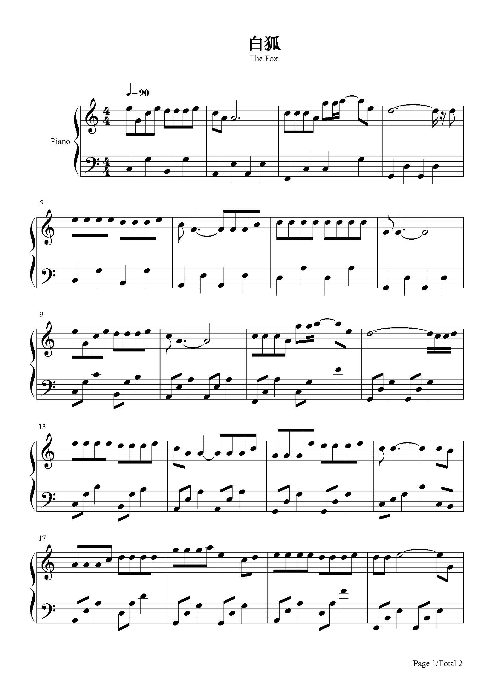 白狐钢琴谱陈瑞c调流行钢琴五线谱
