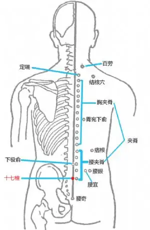 标准定位:十七椎穴在腰部,当后正中线上,第5腰椎棘突下[1][3].
