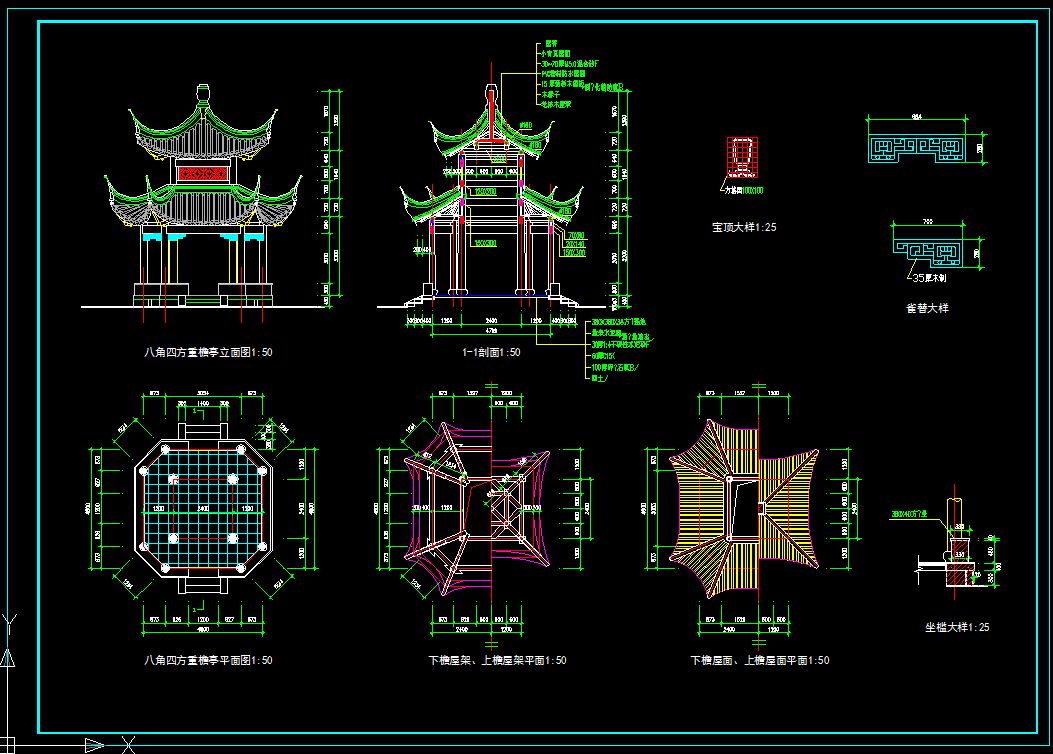 [资料]八角四方重檐亭cad施工图源文件