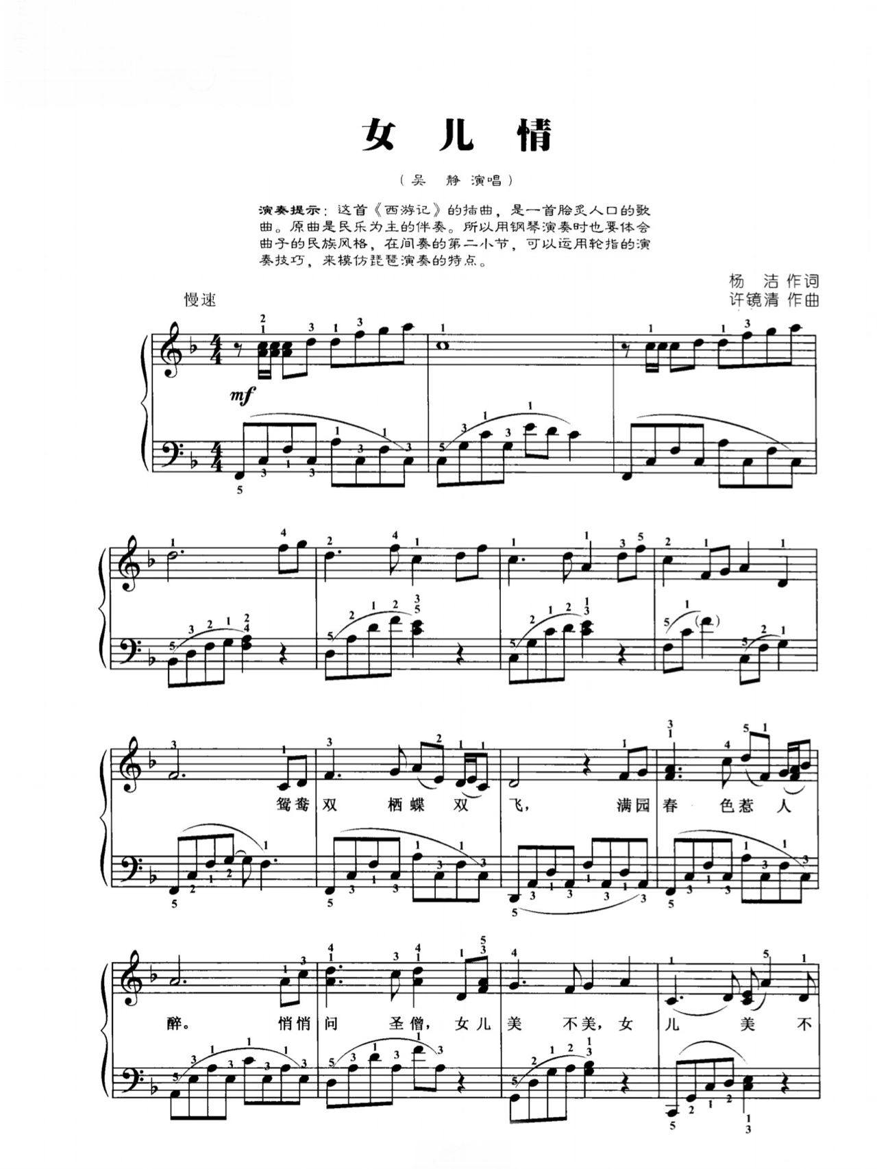 女儿情钢琴谱 带指法 2页免翻 西游记插曲 超清原版 弹唱伴奏独奏