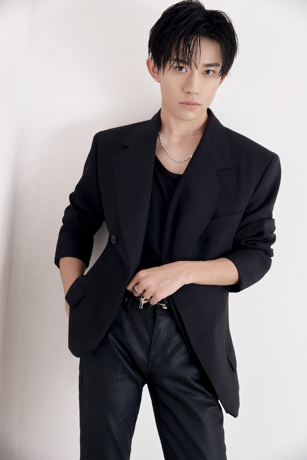 易烊千玺穿着一身黑色西装拍摄大片,脖子上佩戴的钻石项链彰显出他的