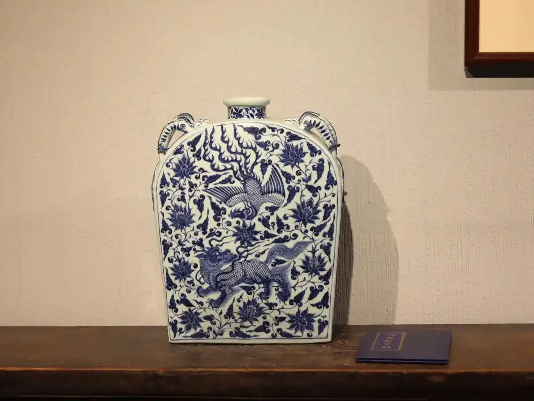 周棋稳亲工复刻元青花麒麟凤纹扁瓶.