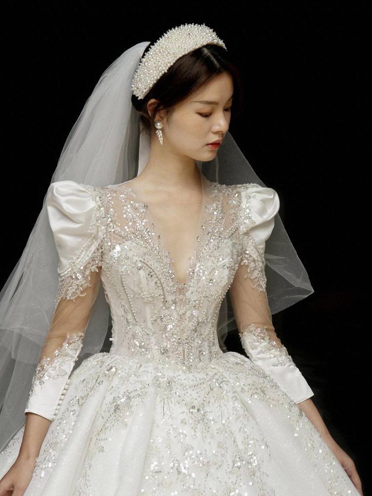 2021新款重工主婚纱长袖v领一字肩新娘仪式奢华宫廷大拖尾冬季女