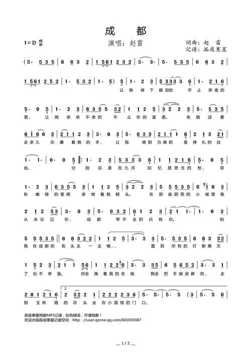 成都简谱(歌词)_赵雷演唱_小弩制谱