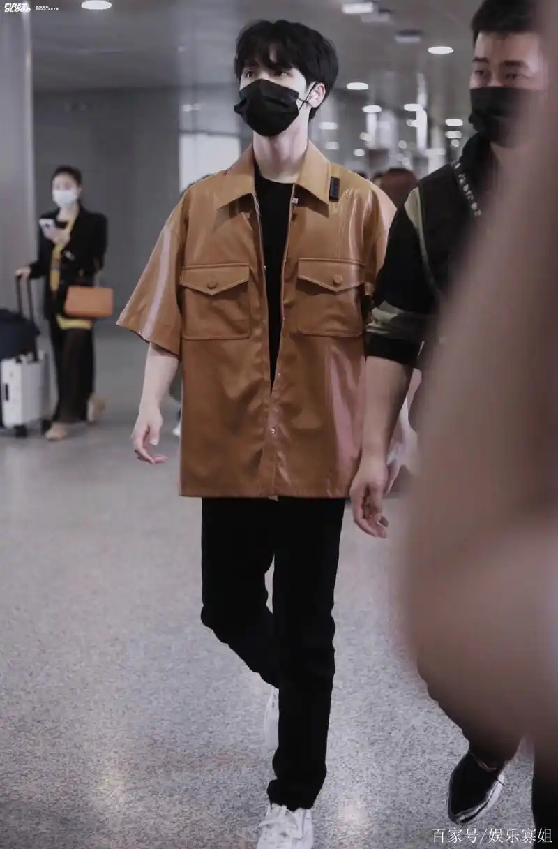 严浩翔今日机场look,棕色皮皮衣搭黑t黑裤,时髦少年,酷帅有型