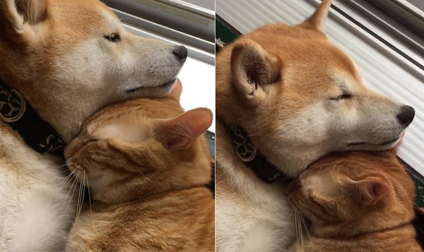 闪瞎影片, 内容是橘喵kijitora rinrin在窗前窝在柴柴gaku的怀里睡觉