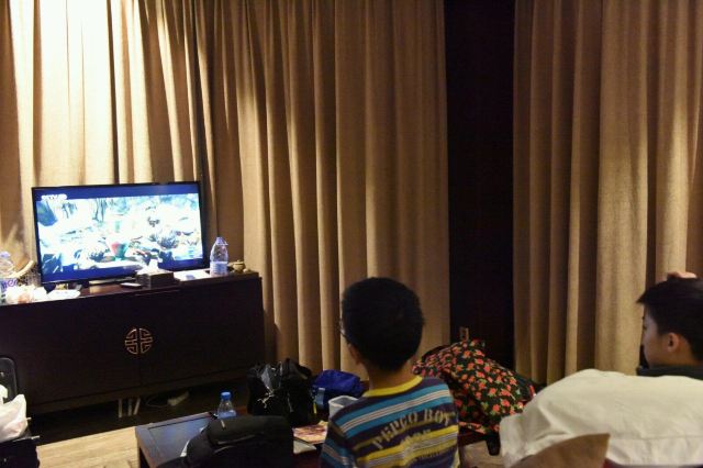 男人在酒店房间看电视