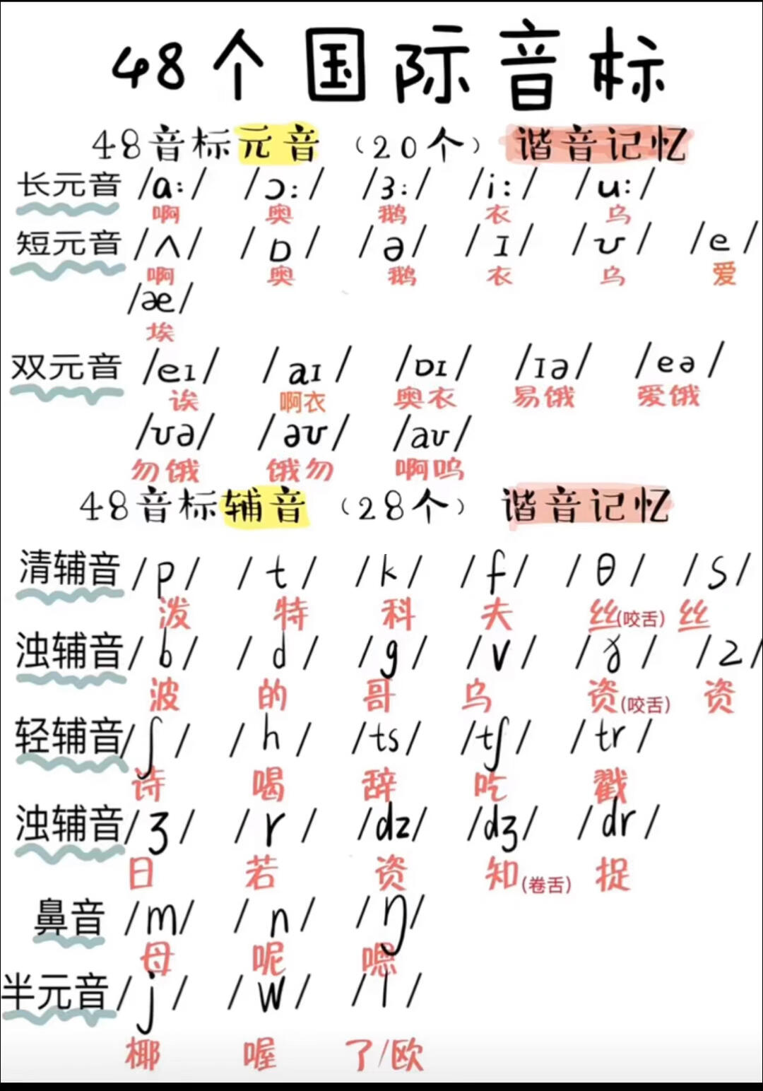 国际音标48,元音20,辅音28这样背