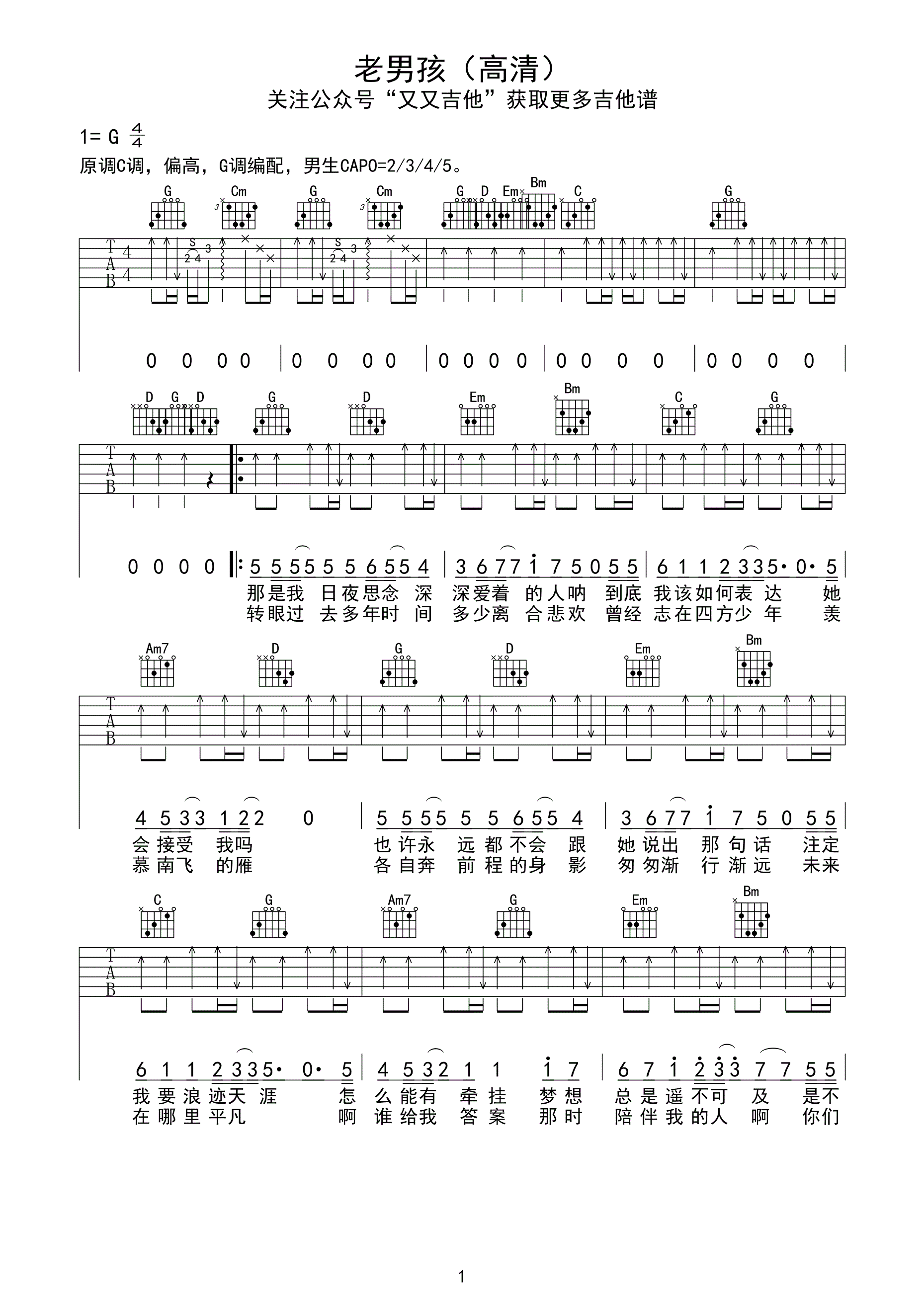 g调编配《老男孩》,根据音域使用变调夹_吉他谱_17吉他网