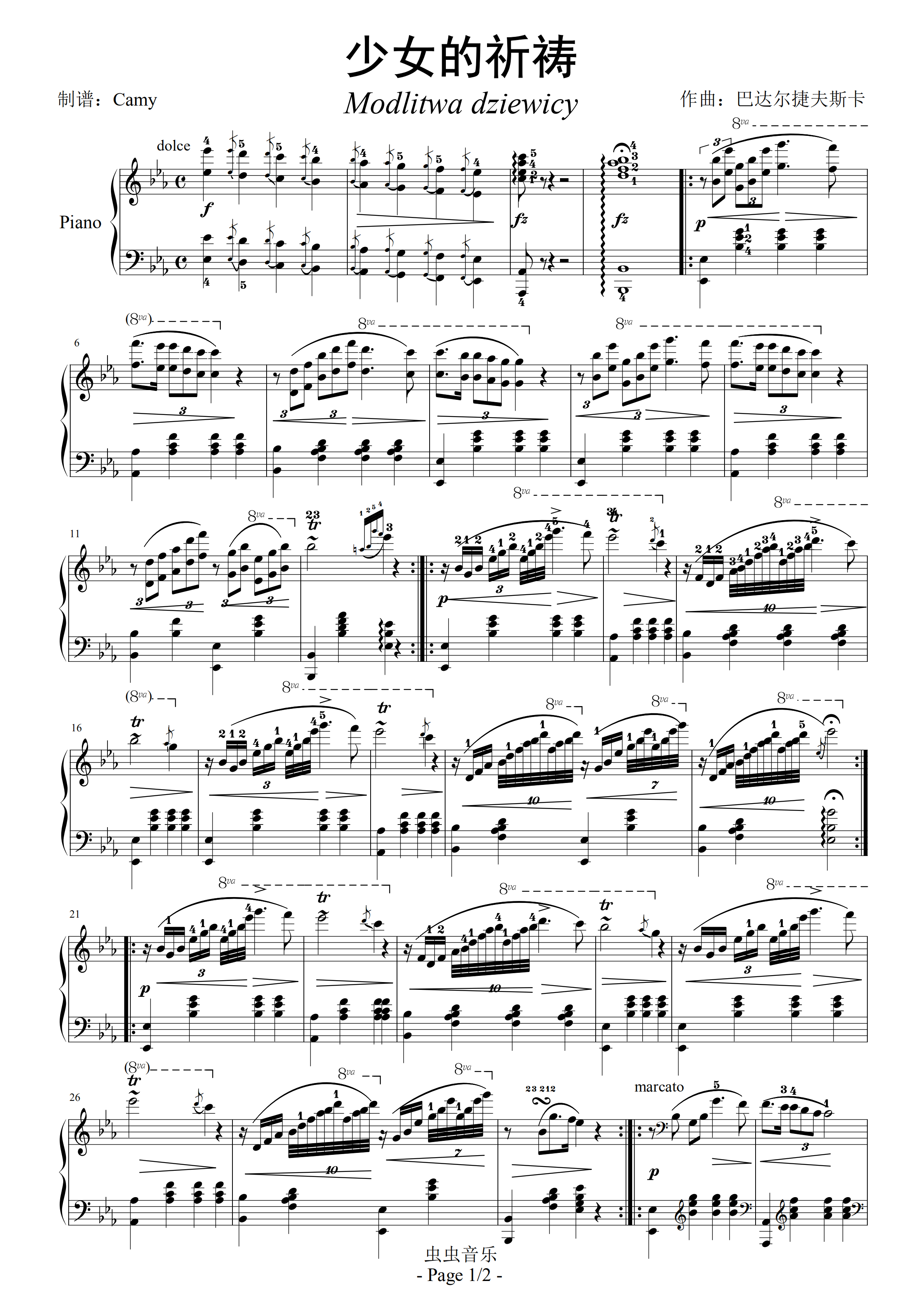 钢琴谱:少女的祈祷-金龙鱼优化版