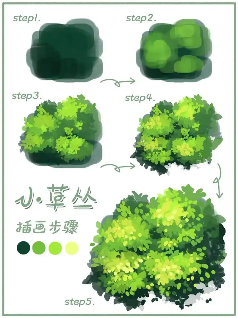 零基础插画教程 教你画小草丛.91step1.选取墨绿色铺大 - 抖音