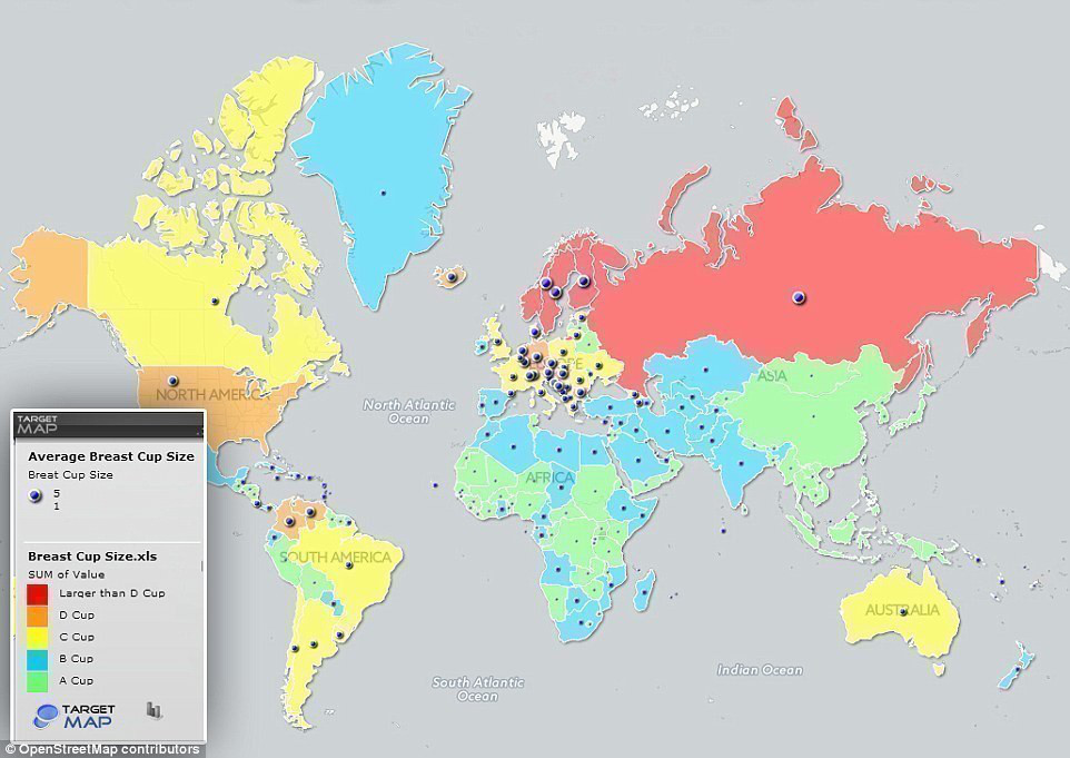 外国数据地图网站target map,近日发表了全球女性胸部大小分布图,堪称