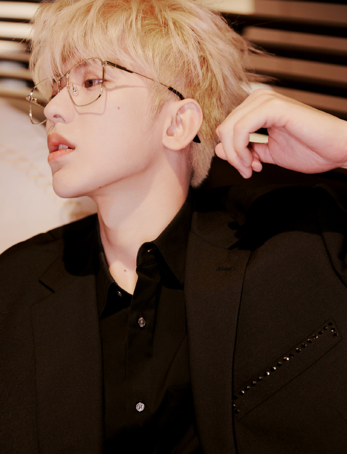 蔡徐坤最新活动造型图金发配黑色西装再戴一副金丝眼镜