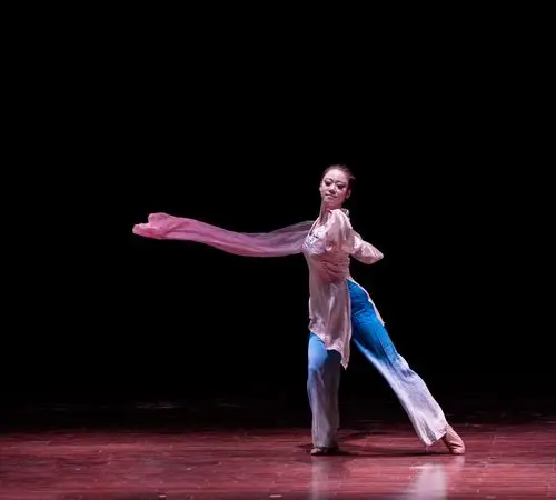 舞蹈东方古典舞年轻美丽的美女舞者在伸着胳膊手臂跳舞姿态优雅韵味