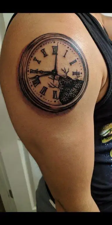 纹身钟表男生手臂上黑灰的钟表纹身图案