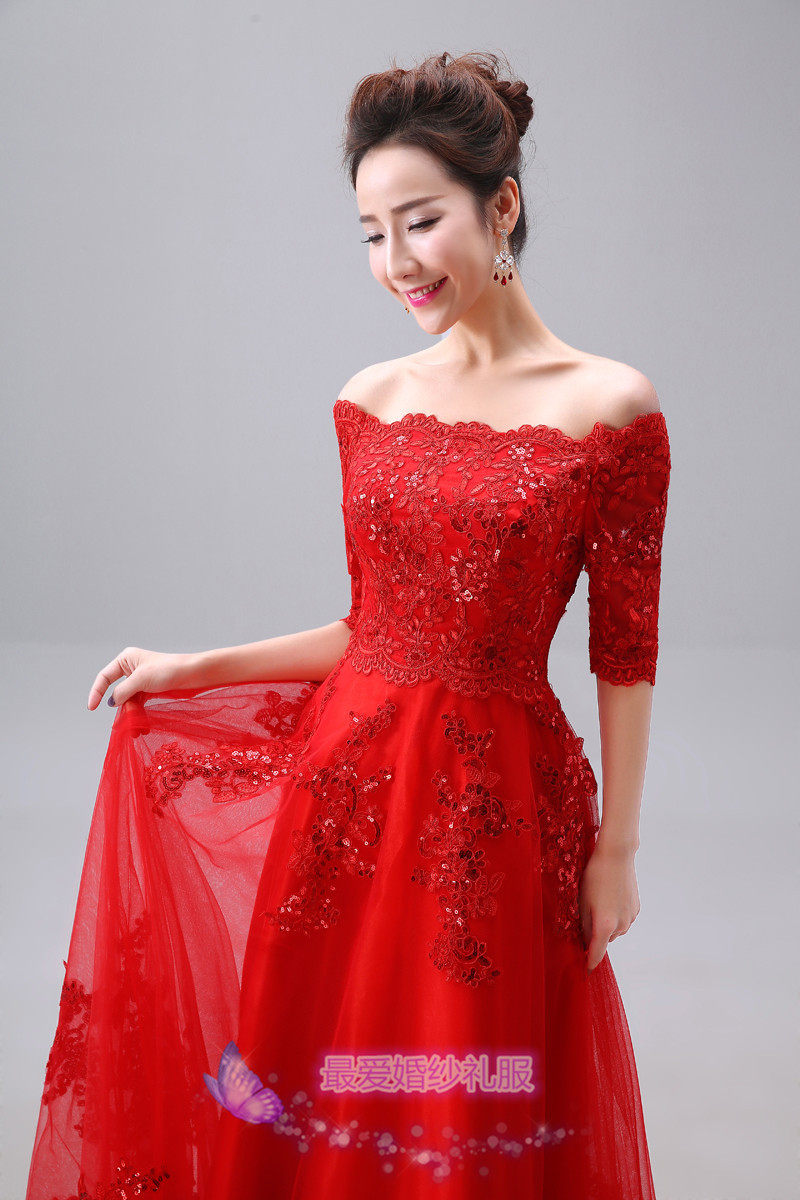 敬酒服新娘时尚2016春新款结婚纱礼服一字肩红色长款宴会晚礼