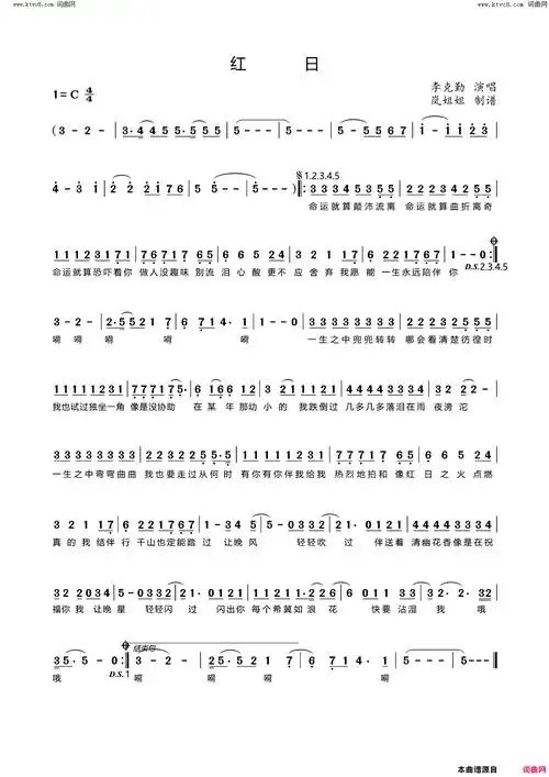 红日简谱-李克勤演唱1