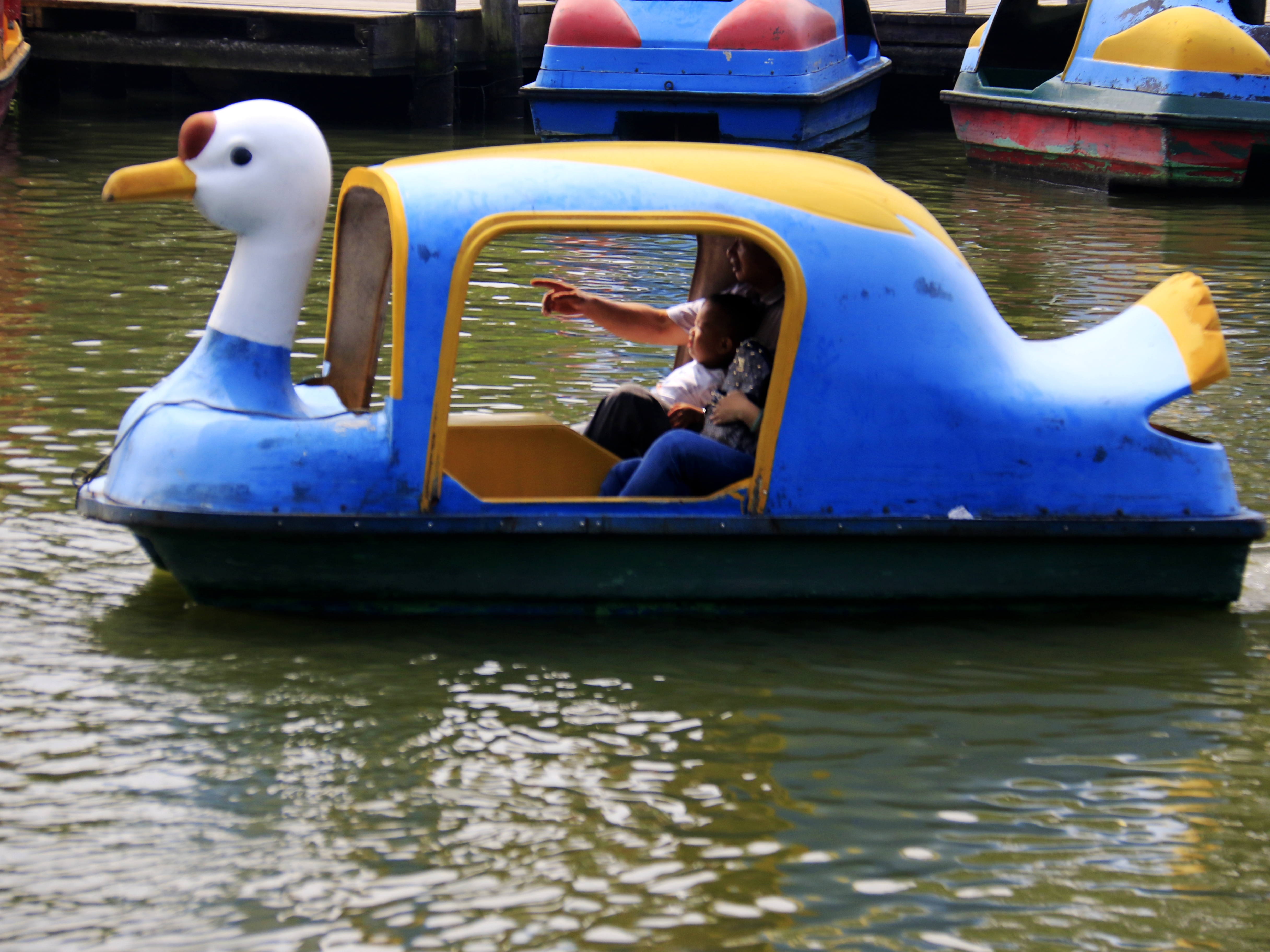 游客可以乘坐这样的小游船,在靠近岸边的水上游玩,乘坐游船的地方排起