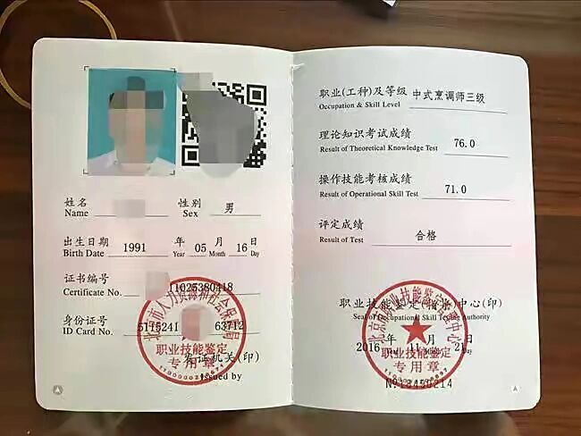 中式烹调师证书