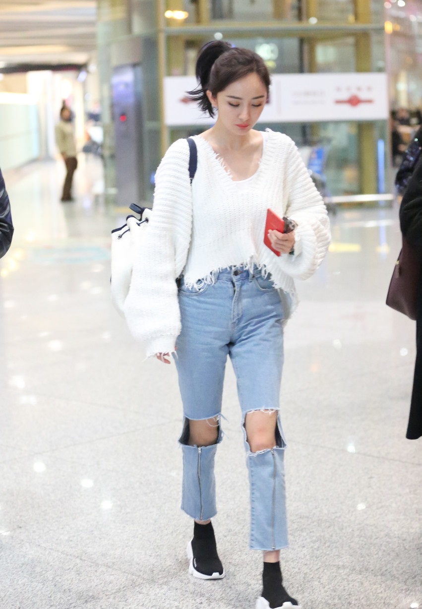 杨幂又出大招毛边毛衣搭配破洞牛仔裤玩转时尚